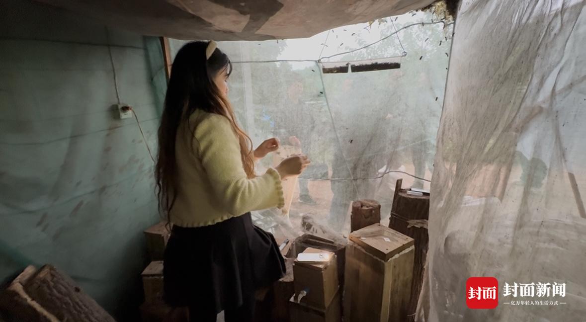 在养殖场入口处,有一个密封网分隔出来的工作间,陈国忠的妻子正在里面分离虎头蜂,没有穿任何防护服装,徒手操作,不时有虎头蜂透过门网飞出来,陈国忠挥手示意记者不必担忧,他所饲养的虎头蜂不会攻击人。