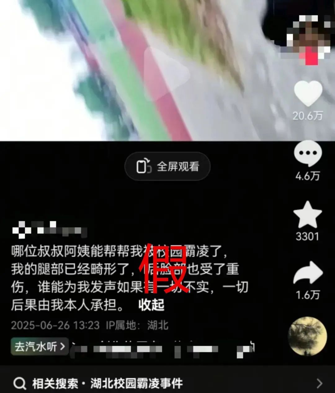 近日,湖北省天门市公安局收到天门市网信办转交的线索,一网民在某短视频平台发布一段“遭遇校园霸凌,寻求帮助”的视频,迅速引发网民高度关注,大量网友表达愤慨和对“受害者”的同情。